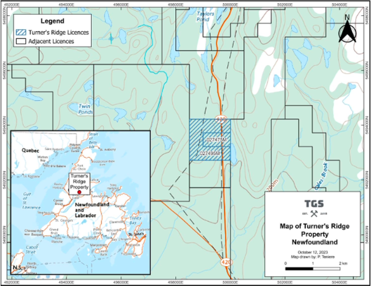 Turner’s Ridge Property is comprised of 2 map-staked mineral exploration licences containing a total of 9 mineral claims covering 225 ha. The Property is located in western Newfoundland within the Province of Newfoundland and Labrador,