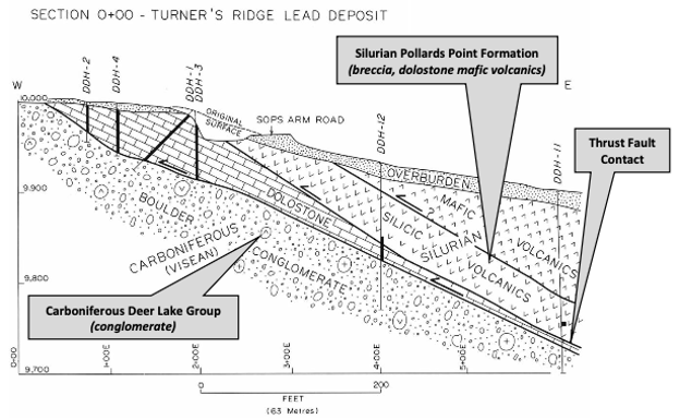 Turner’s Ridge hosts coarse to fine-grained galena with calcite, barite, pyrite, and sphalerite in intensely brecciated Silurian dolostone, where brecciation and alteration provided structural traps for lead-rich fluids likely sourced from the nearby Carboniferous Deer Lake Basin.