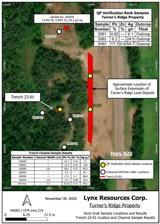 Soil Sampling: 542 soil samples collected on a 1.5 km × 1.0 km grid defined a 700 m × 300 m north–south lead anomaly extending from the Turner’s Ridge showing, with peak values of 9.1 % Pb, 1.3 g/t Ag, 482 ppm Zn, confirming mineralized strike continuity.