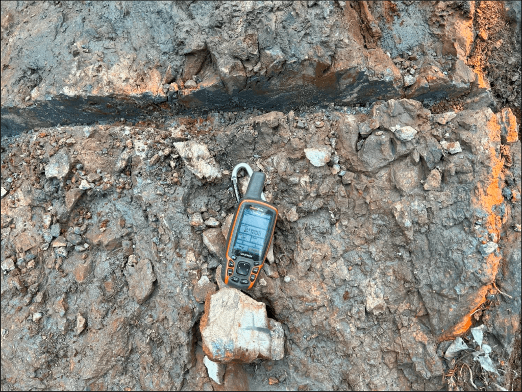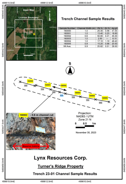 Channel Sampling: Six continuous 1 m samples over a 6 m trench (Trench 23-01) averaged 20.82 % Pb, 0.51 % Zn, 28.5 g/t Ag over 5.9 m, confirming high-grade galena mineralization in brecciated dolomite.